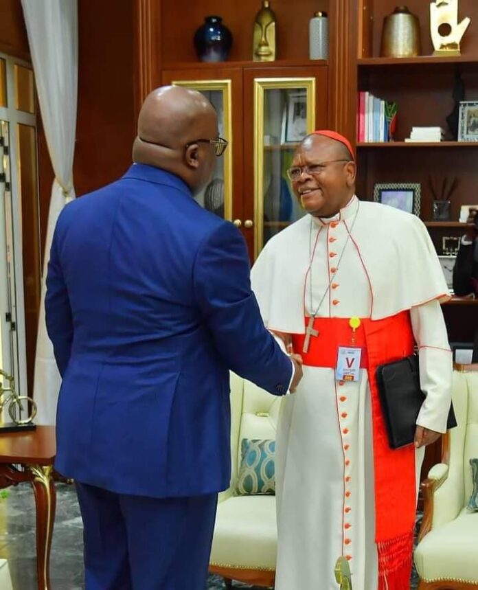 Le Président de la République, Félix Tshisekedi, a échangé, ce jeudi 16 mai 2024, avec le Cardinal Fridolin Ambongo, accompagné du Chargé d’affaires de la Nonciature, Monseigneur Andriy Yevchuk, à la Cité de l’Union Africaine à Kinshasa.